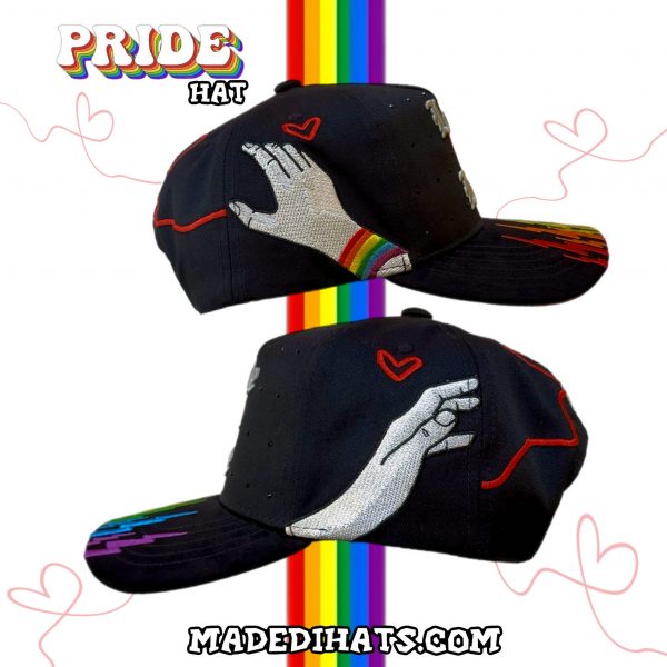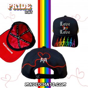En representación al orgullo, hemos creado esta gorra completamente original y exclusiva, con casco en gabardina negra de calidad, diseño frontal con las letras en 3D Love is Love que al centro tiene un corazón rojo y letras con los colores Lgbtq+ acompañado además de pedrería negra, una visera curva de gamuza negra con bordado planos de rayos en colores arcoíris que simbolizan las tormentas que se atraviesan para poder luchar por los derechos de la comunidad LGBTQ+, del lateral izquierdo y derecho se encuentran dos manos bordadas que tratan de unirse mediante un hilo rojo que forma un corazón en la parte trasera, que se interpreta como el amor y la unión que ambos seres tienen pero que de cualquier manera aún son separados por los estigmas sociales aún cuando amor es amor. La parte baja de esta gorra conmemorativa está forrada con tela tipo satín rojo, con cubrecosturas y etiquetas de Madedi Hats.